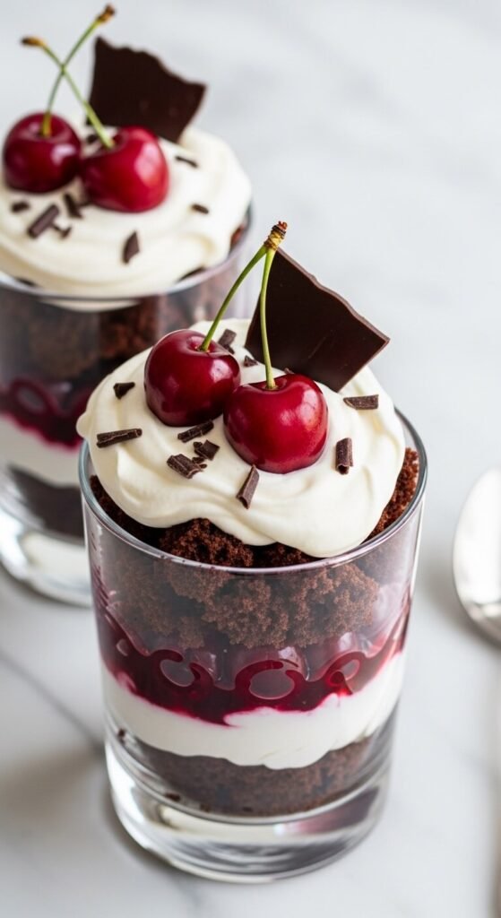 Chocolate cake crumbles, dark cherry compote, and freshly whipped cream in individual glasses recreate Black Forest cake in cup form — each serving is perfectly portioned and visually dramatic.