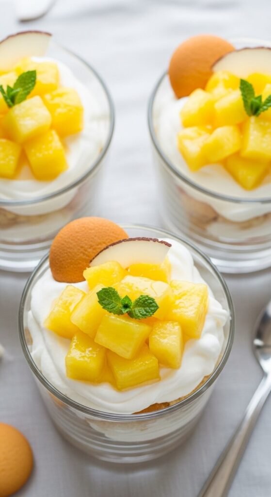 Fresh pineapple on top of coconut whipped cream with a vanilla wafer base is a tropical cup that takes ten minutes, requires zero cooking, and works beautifully for summer gatherings.