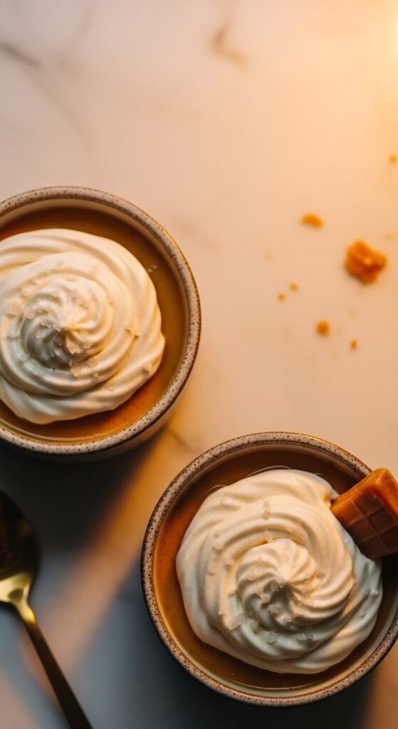 A set caramel pudding topped with lightly salted whipped cream is one of the most sophisticated simple cups you can make — and the salty-sweet contrast makes it completely addictive.
