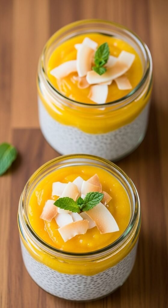 Chia seeds set overnight in coconut milk and topped with blended mango create a two-layer cup that requires zero cooking and zero attention beyond a quick stir before bed.