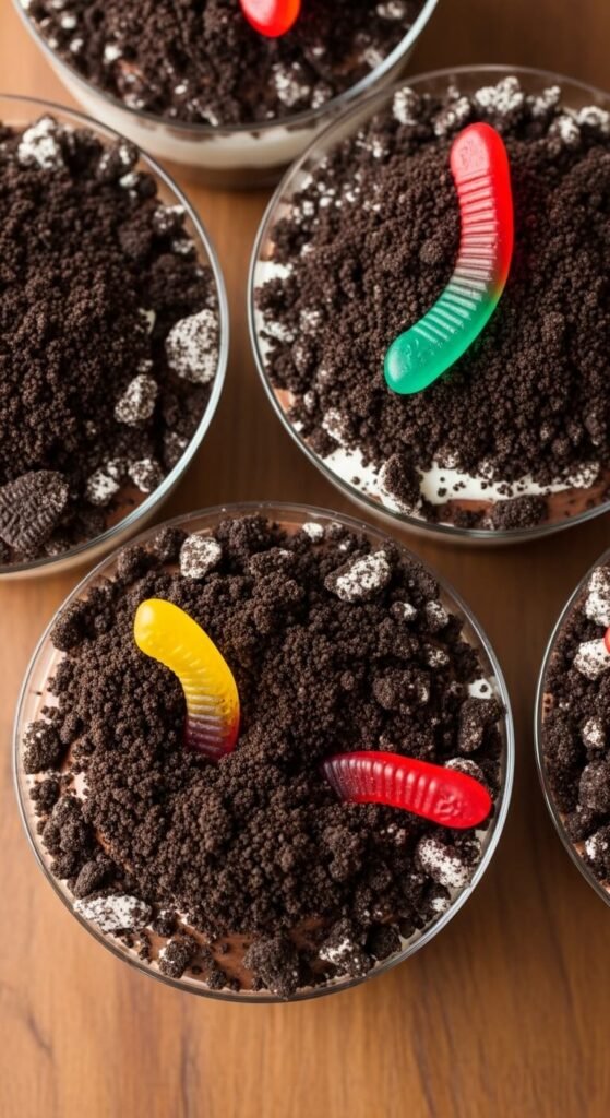 Make instant chocolate pudding according to the package instructions and let it set in the fridge for 30 minutes. Spoon into individual cups. Top generously with crushed Oreos to create a “dirt” layer.