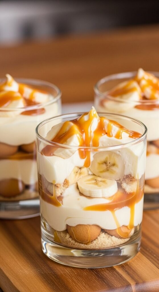 Make instant vanilla pudding and let it firm up for 20 minutes. Layer crushed vanilla wafers, sliced bananas, and pudding in small glasses. Repeat layers once. Finish with a drizzle of caramel sauce and a single vanilla wafer pressed into the top.
