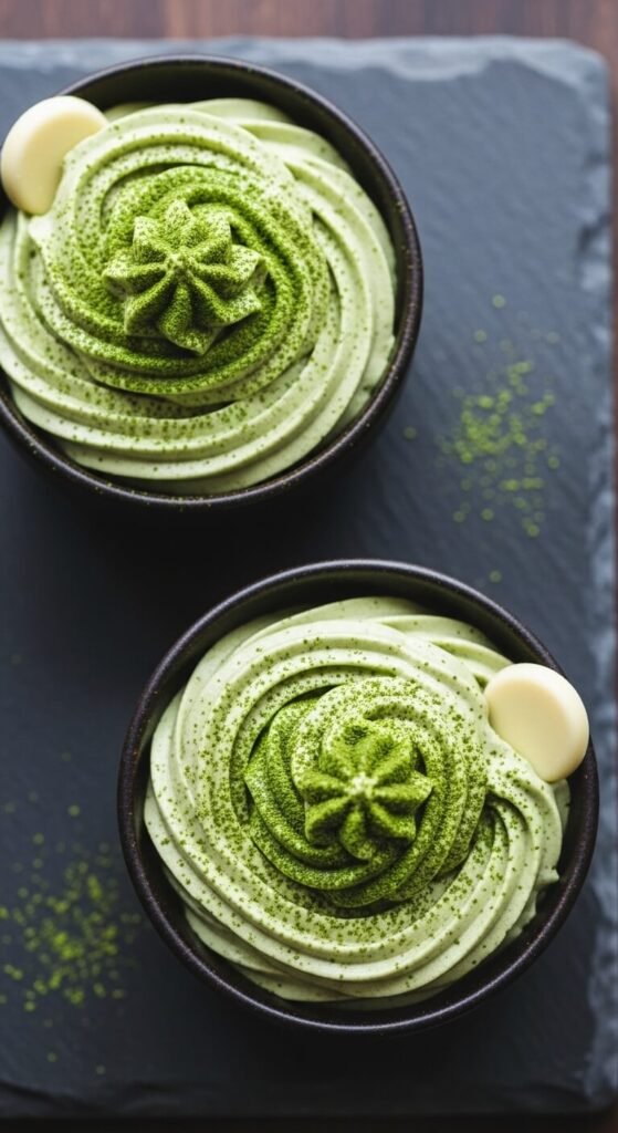 Matcha folded into whipped white chocolate ganache creates a mousse that is earthy, slightly sweet, and a distinctive pale green that looks genuinely striking in small cups.