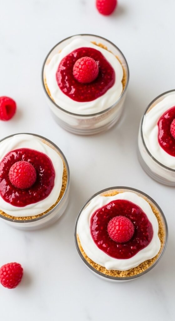 A crushed graham cracker base, sweetened cream cheese filling, and fresh strawberry topping create a cheesecake cup that looks assembled rather than baked — and tastes every bit as good.