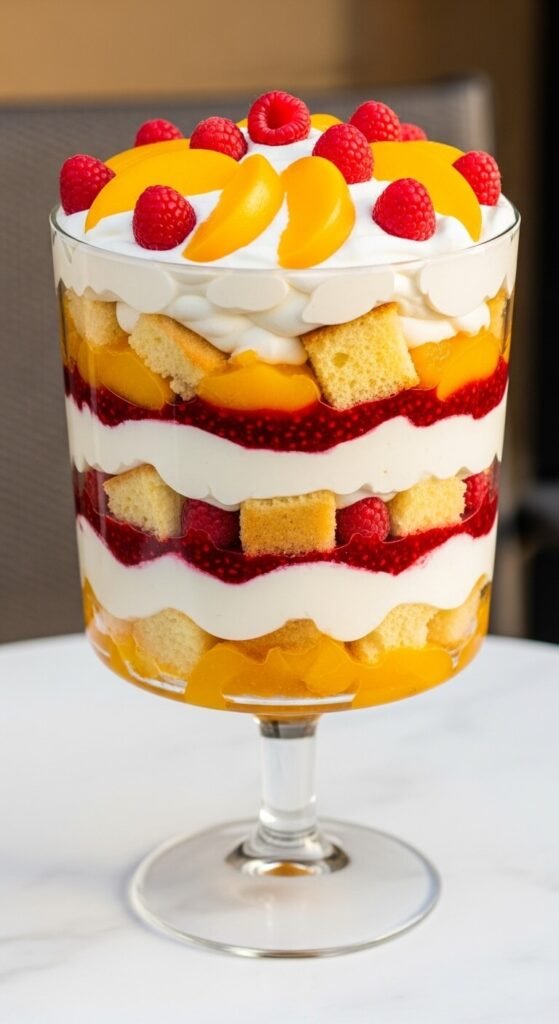 Cubed pound cake, peach compote, vanilla cream, and raspberry sauce in alternating trifle layers produce a summer dessert that serves 16 for about $12 and looks genuinely impressive viewed through the clear vessel. Cube store-bought pound cake. Make a simple peach compote by simmering diced peaches with sugar and lemon juice for five minutes. Layer cake, peach compote, vanilla cream, and a drizzle of seedless raspberry jam thinned with water in three complete cycles. Top with whipped cream, fresh peach slices, and whole raspberries. Refrigerate two hours minimum. Budget tip: canned sliced peaches in juice at $1.80 per can produce compote with flavor identical to fresh during months when peaches are not in season locally.