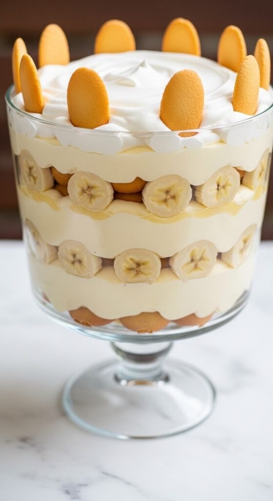 Nilla wafers, vanilla pudding cream, and sliced bananas in alternating trifle layers is the summer potluck dessert that disappears before every other item on the table. Beat 8 oz cream cheese into prepared instant vanilla pudding while still warm — the cream cheese adds stability and richness that pudding alone doesn’t maintain overnight. Layer with banana slices and Nilla wafers in three complete cycles. Top with freshly whipped cream and whole wafers standing upright around the edge. Refrigerate four hours. The wafer layers soften into a genuinely cake-like texture overnight — this is the correct result, not a flaw. Serves 12 for about $8. Budget tip: store-brand vanilla pudding costs $0.80 per box.