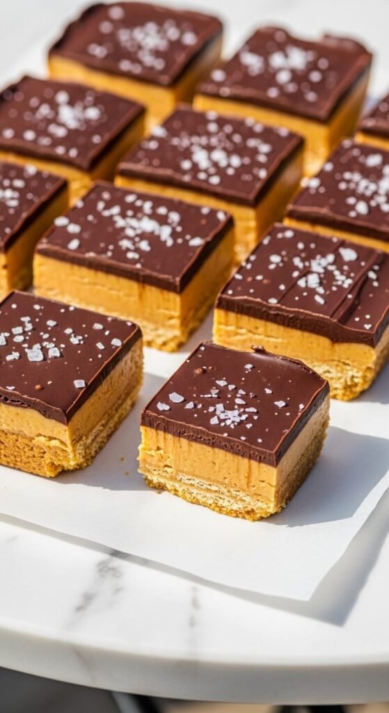 The no-bake bar that people request the recipe for most consistently — peanut butter, butter, powdered sugar, and graham cracker crumbs pressed into a pan with a dark chocolate top and sea salt finish. Mix 1½ cups peanut butter, ½ cup melted butter, 2 cups powdered sugar, and 1½ cups graham cracker crumbs until cohesive. Press firmly into a parchment-lined 9×13 pan. Refrigerate 15 minutes. Pour melted dark chocolate mixed with two tablespoons of peanut butter and one tablespoon of coconut oil over the base. Scatter flaky sea salt before the chocolate sets. Refrigerate one hour. Cut into 24 bars. The full batch costs about $6 in ingredients — about $0.25 per bar.