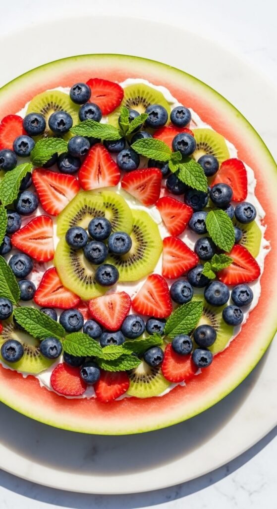 A thick round watermelon cross-section serves as the base for a cream cheese-topped fruit pizza that is simultaneously the most visually impressive and most effortless summer dessert on this list. Cut a 1-inch thick round slice from the center of a large watermelon. Spread with sweetened cream cheese — 4 oz cream cheese beaten with two tablespoons of powdered sugar, ½ teaspoon vanilla, and one teaspoon of lime zest. Top with sliced kiwi, blueberries, and strawberry halves arranged in concentric color rings. Slice like a pizza and serve immediately. The circular fruit arrangement looks intentional and beautiful with minimal effort. Total assembly time: about eight minutes.