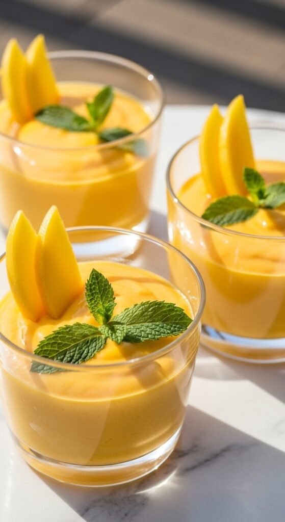 Mango puree folded into whipped cream and cream cheese produces a mousse with a naturally vivid orange color that requires no food dye and a concentrated tropical flavor that tastes genuinely summery. Puree one cup of fresh or thawed mango until completely smooth. Strain through a fine mesh sieve. Beat the strained puree into 4 oz softened cream cheese with powdered sugar. Fold in one cup of cold whipped heavy cream. Spoon into glasses. Refrigerate two hours. Top with a thinly sliced mango fan and fresh mint. Budget tip: canned mango pulp from the international section costs about $2 per can and produces consistent sweetness year-round when fresh mango quality is variable.