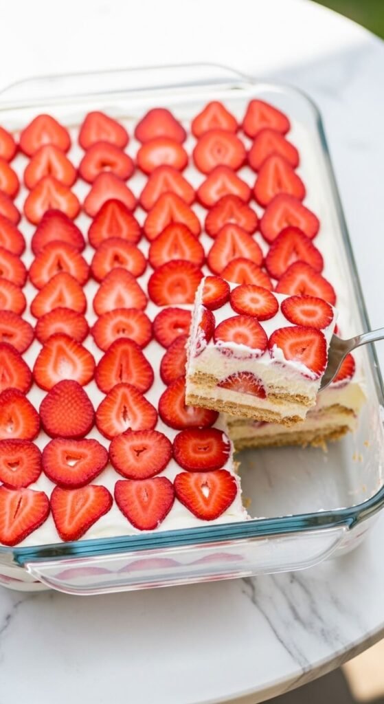 Graham crackers layered with sweetened whipped cream and fresh sliced strawberries overnight produces a layered dessert that looks like significantly more effort than the assembly actually involved. Whip two cups of heavy cream with three tablespoons of powdered sugar and one teaspoon of vanilla to firm peaks. Layer graham crackers, cream, and sliced strawberries in a 9×13 dish in three complete cycles. Top with a final cream layer and cover the entire surface with overlapping strawberry slices in neat rows. Refrigerate overnight minimum. The crackers soften into tender cake-like layers that hold their shape when served with a spatula. Serves 16 for about $8 total in ingredients.
