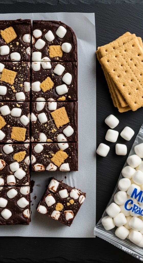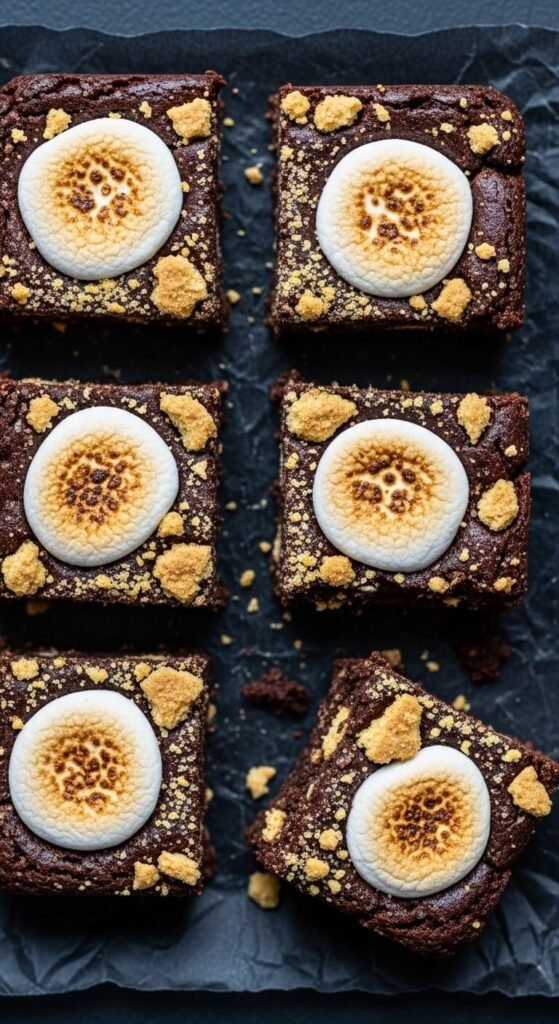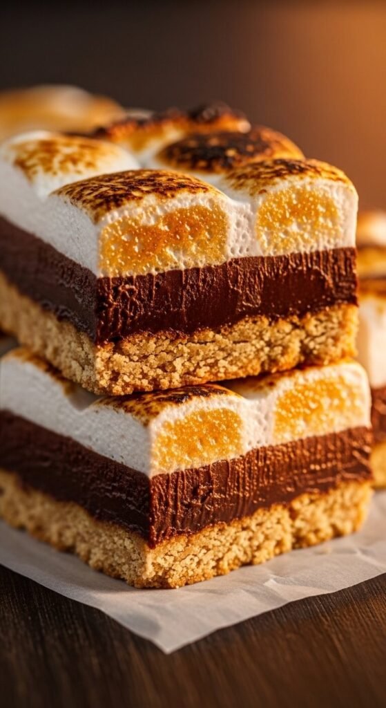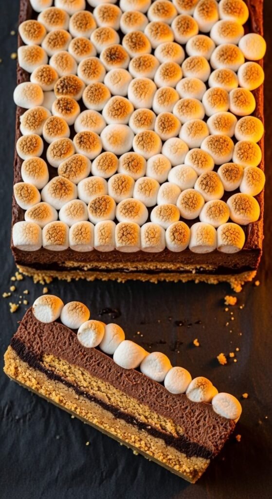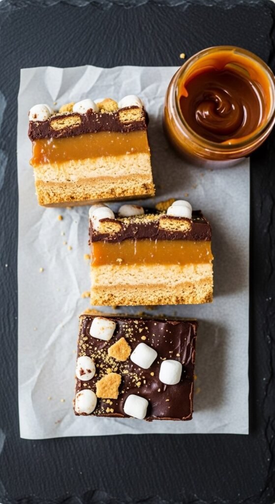 A pressed graham cracker crust base, a thick layer of store-bought caramel sauce chilled until firm, and a dark chocolate ganache top with crushed graham crackers and mini marshmallows pressed into the still-wet ganache surface before refrigerating creates a s’mores bar with a caramel layer that makes it genuinely extraordinary. Add flaky sea salt across the caramel layer before adding the ganache — the salt cuts through the combined sweetness of caramel, chocolate, and marshmallow and creates a balanced, multi-layered bite. These bars need at least five hours of chilling between layers. Make them two days ahead for the cleanest cuts.