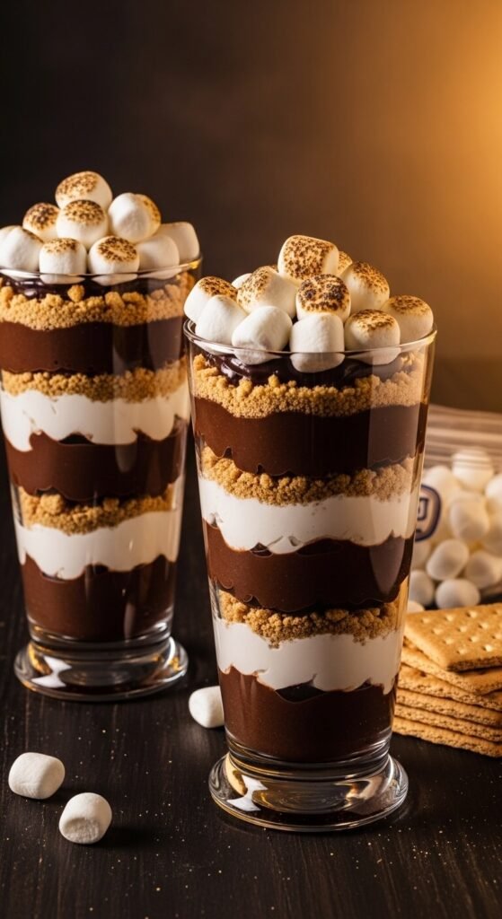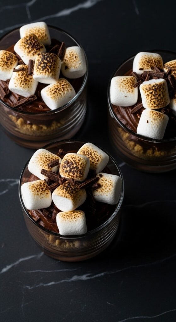 Press crushed graham cracker crumbs into the base of small glass cups, fill with a no-bake dark chocolate mousse (dark chocolate melted with heavy cream and cooled until thick, then whipped with additional cream until light and airy), and top with toasted mini marshmallows and dark chocolate shavings. The graham cracker crumbs provide the base layer, the mousse provides the chocolate middle, and the torched marshmallows provide the top — three distinct s’mores layers in one glass cup. These can be assembled through the mousse layer up to 24 hours ahead. Add and torch the marshmallow topping within an hour of serving for the best visual and textural result.
