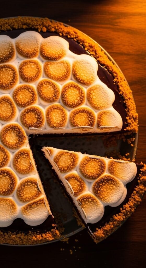 Press a thick graham cracker crust into a standard pie dish, fill with a dark chocolate ganache (chocolate chips and heavy cream) that has been whisked until thick and slightly cooled, and refrigerate until completely set — at least four hours. Spread a generous layer of marshmallow fluff or meringue across the top of the cold pie and use a kitchen torch to brown it thoroughly just before serving. The marshmallow top adds a dramatic, campfire-style visual finish that makes this pie look like it belongs in a restaurant dessert case. Serves eight and keeps refrigerated for up to three days.