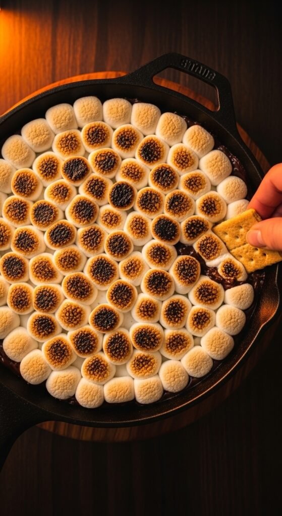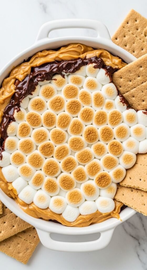 Add a generous layer of peanut butter between the chocolate chips and the marshmallows in the standard s’mores dip recipe — the peanut butter melts into the chocolate beneath and creates a Reese’s-meets-s’mores flavour that is genuinely one of the best things you can serve at a casual gathering. Use creamy peanut butter spread in an even layer over the chocolate chips before covering with marshmallows and torching. The three melted layers — chocolate, peanut butter, marshmallow — blend together when you drag a graham cracker through, coating it with all three flavours simultaneously. Serve immediately while everything is warm and gooey.