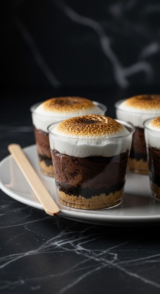 Graham cracker crumbs pressed into the base of clear plastic cups, topped with a no-bake dark chocolate cheesecake filling (cream cheese, melted dark chocolate, powdered sugar, and a splash of vanilla), and finished with mini marshmallows torched just before serving creates a portable s’mores dessert that works beautifully for buffets, parties, and outdoor events where individual servings are more practical than a shared pan. Clear cups make the layers visible from the outside, which is the main visual appeal of this format. Make the bases and fill the cups the day before — only add and torch the marshmallows on the day of serving.