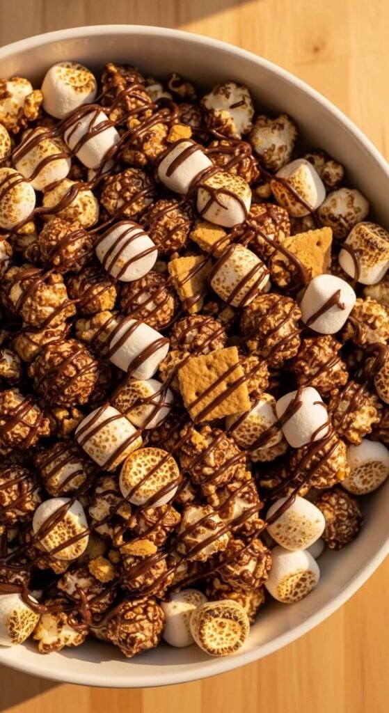Plain popped popcorn drizzled with melted dark chocolate, tossed with crushed graham crackers and mini marshmallows creates a s’mores snack mix that’s far more interesting than standard caramel popcorn and costs almost nothing to make. Let the chocolate drizzle set slightly before adding the marshmallows so they don’t melt entirely. Use salted popcorn for the best sweet-salty result — the salt against the sweet chocolate and marshmallow is the combination that makes this mix genuinely addictive. Spread on parchment to set fully before breaking into clusters and serving. Budget tip: air-popped popcorn is the cheapest base option and provides the cleanest flavour for the chocolate coating.