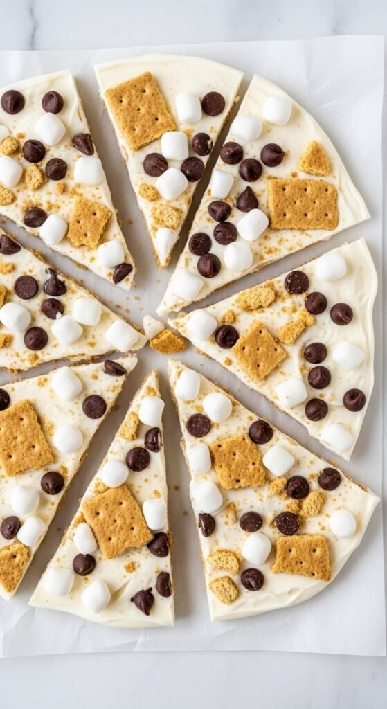 Spread full-fat Greek yogurt sweetened with honey and vanilla in a thin layer on parchment-lined baking sheet, scatter crushed graham crackers, mini chocolate chips, and mini marshmallows across the surface, pressing them in slightly, and freeze for three to four hours until solid. Break into rough irregular pieces and serve immediately from the freezer. This is one of the lightest s’mores desserts on this list — the yogurt base is tangy and less sweet than a ganache or cheesecake base, which makes the graham cracker and chocolate toppings stand out more clearly. Store pieces in a zip-lock bag in the freezer for up to two weeks.