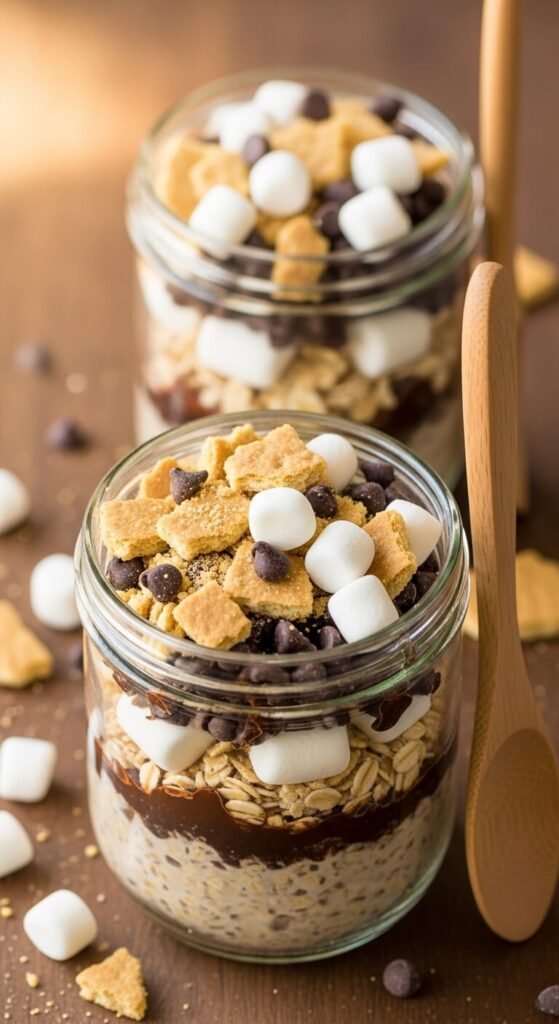 Rolled oats, cocoa powder, honey, milk, and a tablespoon of nut butter combined in a jar and refrigerated overnight with crushed graham crackers, mini chocolate chips, and mini marshmallows stirred through creates a s’mores dessert that doubles as a completely legitimate breakfast or snack. The graham crackers soften overnight into the oats, and the marshmallows stay slightly chewy. Add extra toppings — a drizzle of chocolate, fresh cracker crumbs, and a few toasted marshmallows — just before eating. This is the most practical s’mores recipe on the list for anyone wanting the flavour in a format that works outside of a dessert context.