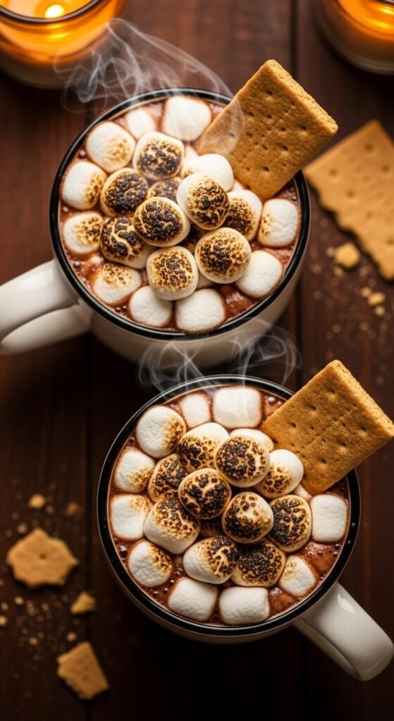 Rich hot chocolate made from whole milk and melted dark chocolate chips (not cocoa powder — melted chocolate creates a far richer, thicker result), poured into mugs, topped with mini marshmallows and torched until deeply golden, and served with a whole graham cracker resting against the side of each mug for dunking creates a s’mores hot chocolate experience that is as satisfying to make as it is to drink. Add a pinch of sea salt to the hot chocolate itself — it makes the chocolate taste more intense and the sweetness of the marshmallows more balanced. Best served on cool evenings as a dessert drink.