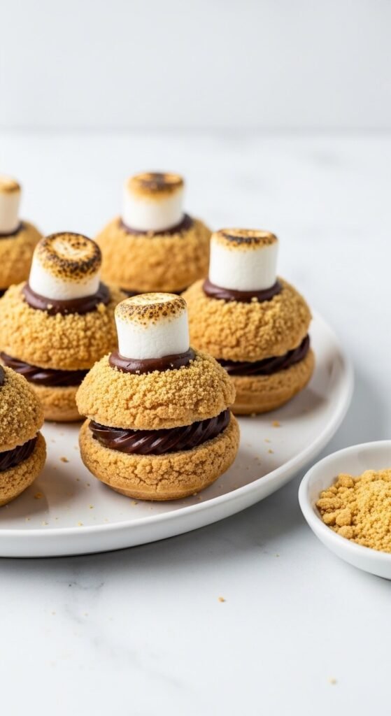 Use store-bought profiteroles or cream puff shells, pipe a no-bake dark chocolate cream filling inside (heavy cream whipped with cocoa powder and powdered sugar until thick), press the two halves together, roll the outer edge in finely crushed graham cracker crumbs, and press a single mini marshmallow on top of each one. Toast the marshmallow with a kitchen torch just before serving. This no-bake assembly method turns a purchased product into a plated dessert that looks genuinely homemade and impressive. Budget tip: store-bought frozen profiteroles are inexpensive, thaw in 20 minutes, and provide the perfect base for this quick assembly approach.
