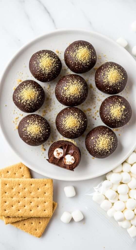 Cream cheese beaten with melted dark chocolate, crushed graham crackers, and mini marshmallows folded through creates a s’mores truffle mixture that can be refrigerated until firm and then rolled into balls. Refrigerate the mixture for two hours before rolling — the marshmallows soften into the filling and create chewy pockets throughout every truffle. Dip each ball in melted dark chocolate and immediately roll in finely crushed graham cracker crumbs before the coating sets. Press a single mini marshmallow into the top of each truffle. These look professional, travel well in a tin, and make excellent edible gifts.