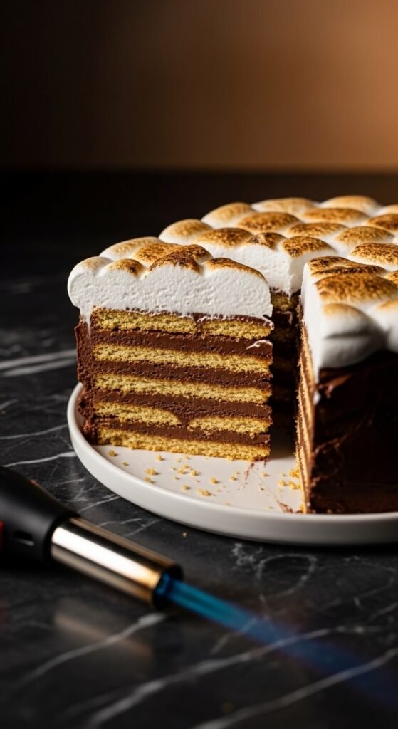 A thick graham cracker and butter crust pressed into a 9×13-inch pan, topped with a dark chocolate no-bake cheesecake filling (cream cheese, melted dark chocolate, powdered sugar, vanilla, and whipped cream folded through), refrigerated overnight, then covered entirely in mini marshmallows and torched just before serving creates a s’mores cheesecake slab that slices into clean, generous pieces and feeds up to 16 people from a single pan. The larger format makes this ideal for gatherings rather than individual servings. Cut with a hot knife and serve within an hour of torching for the best marshmallow texture.