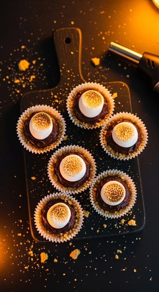A crushed graham cracker crust base, chocolate cream cheese filling (cream cheese beaten with melted dark chocolate and powdered sugar), and a single mini marshmallow torched golden on top creates one of the most impressive individual dessert bites on this list. Make the crust bases and filling the day before. Refrigerate overnight. Add the marshmallow and torch it just before guests arrive — the torching takes 60 seconds for a full batch of 24 bites and the visual result is striking. Scatter extra crushed graham cracker crumbs across the serving board as a presentation detail that ties the s’mores theme together.