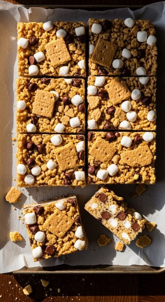 Crushed graham crackers folded into the standard marshmallow-butter-cereal mixture alongside mini chocolate chips and whole mini marshmallows added after the heat is off creates a s’mores rice crispy treat that has every s’more flavour element in one chewy square. Add the graham crackers as about a half cup alongside four cups of rice cereal — they add a slightly denser, buttery flavour to the base. The mini marshmallows added off-heat stay whole and soft inside the finished treat rather than melting into the mixture. Press extra chocolate chips into the top surface while still warm.