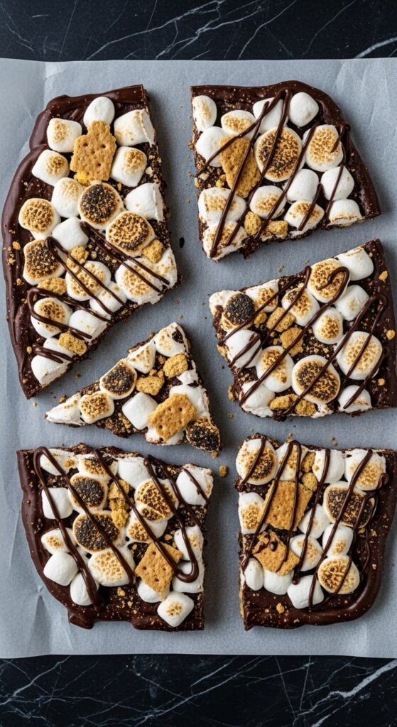 Spread melted dark chocolate in a thin, even layer on parchment, scatter crushed graham crackers across the surface, press mini marshmallows into the chocolate, and refrigerate until set before snapping into irregular shards. Before refrigerating, use a kitchen torch to briefly toast the marshmallow tops — the caramelised patches on the marshmallow surface add the signature s’mores smokiness that raw marshmallow doesn’t have. Drizzle extra melted chocolate across the top for a finished appearance. This bark is an ideal make-ahead party treat — it keeps refrigerated for two weeks and looks impressive broken into rough pieces on a serving board.