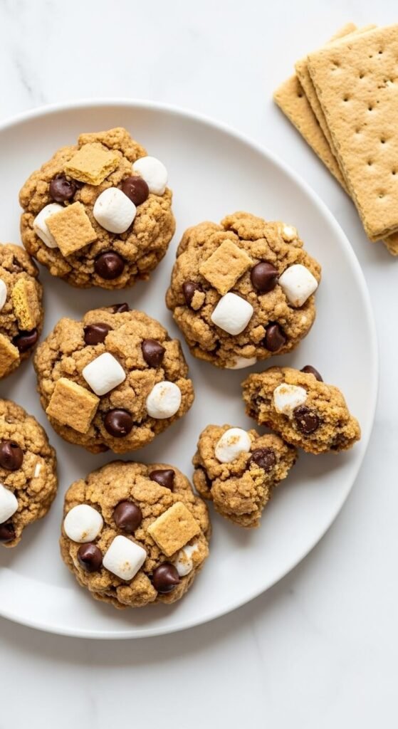 The standard no-bake cookie method — butter, sugar, milk, and cocoa powder brought to a rolling boil, then poured over oats — gets a s’mores treatment by replacing half the oats with crushed graham crackers and mini marshmallows added after the heat is off. Add the marshmallows immediately before dropping onto parchment so they soften slightly but don’t melt completely. Drop by spoonfuls onto parchment and let set at room temperature for 30 minutes. The graham crackers give a slightly denser, crumblier texture than all-oat versions. These set faster on a cool day and slower in summer heat — refrigerate them if your kitchen is warm.