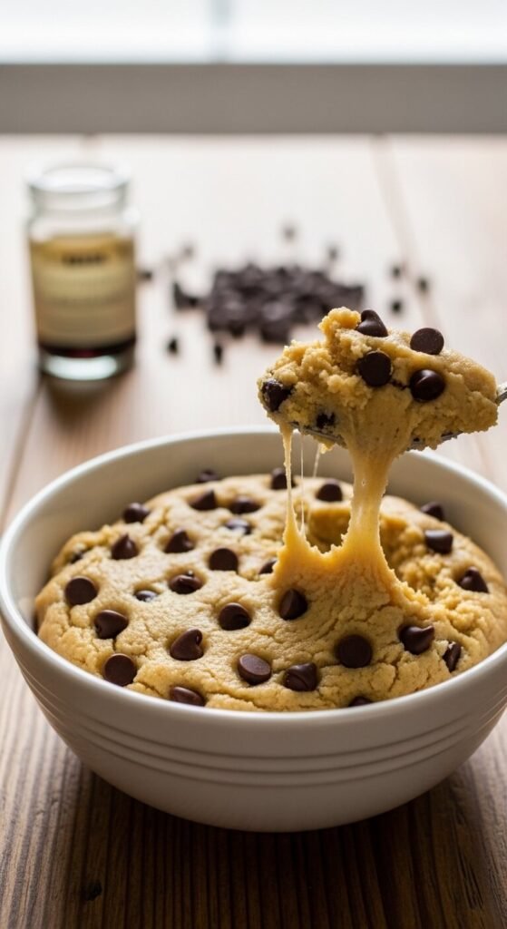 This is the one everyone reaches for first. Heat-treated all-purpose flour, softened butter, brown sugar, and vanilla come together in minutes. The key is getting the flour temperature right — 165°F in the microwave or oven kills any bacteria without cooking the dough. Once it cools, mix in powdered sugar, a splash of milk for consistency, and a generous handful of mini chocolate chips. Keep it in the fridge for up to a week. Eat it straight from the bowl, no apologies needed.