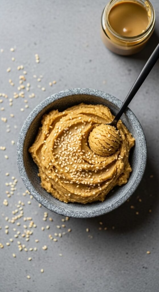 Tahini does the same job peanut butter does in an egg-free dough — it binds, adds richness, and contributes a slightly nutty depth that makes the whole thing taste more complex than it is. This dough needs no flour at all. Mix tahini with softened butter, honey or maple syrup, vanilla, powdered sugar, and a pinch of salt. Stir in sesame seeds and white chocolate chips for texture. It’s naturally nut-free if tahini is safe for your household, making it a great allergy-friendly alternative to peanut butter dough.
