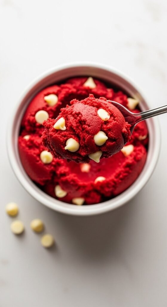 Red velvet dough is as visually dramatic as it is delicious — that deep crimson colour against white chocolate chips makes it one of the most striking doughs on this list. Use heat-treated flour mixed with a small amount of cocoa powder, butter, powdered sugar, cream cheese, and vanilla. A touch of red gel food colouring (not liquid — gel gives a more concentrated colour without affecting consistency) transforms it instantly. The cream cheese adds a subtle tang that makes it taste remarkably like actual red velvet cake batter.