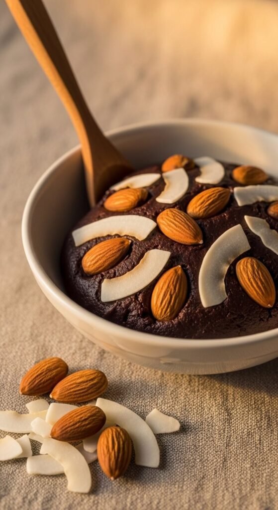 Everything you love about an Almond Joy candy bar — now in a spoonable dough. Start with a chocolate-cocoa dough base using heat-treated flour, melted dark chocolate, butter, and brown sugar. Stir in sweetened shredded coconut and whole roasted almonds. A quarter teaspoon of coconut extract alongside the vanilla deepens the tropical note without making it taste artificial. Chill this one for at least 30 minutes before eating — cold almond joy dough firms up into something that tastes genuinely like an elevated candy bar filling.