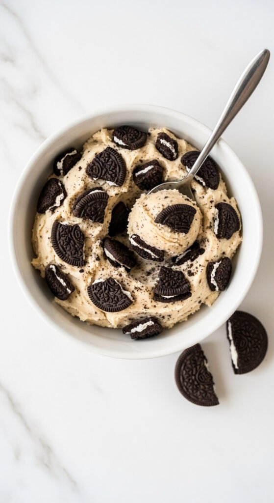 Crushed Oreos mixed into a creamy vanilla dough base is exactly as good as it sounds. Use heat-treated flour, cream cheese, softened butter, and powdered sugar for the base — the cream cheese makes it taste like Oreo cheesecake dip more than cookie dough, which is not a complaint. Crush the Oreos roughly — you want chunks, not crumbs — so every spoonful has pieces of cookie that give a little crunch. Add a splash of heavy cream if the dough feels too stiff. Serve it chilled alongside a spoon and watch it disappear.