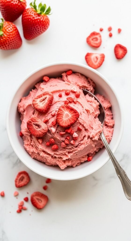 Freeze-dried strawberries are the ingredient that makes this recipe exceptional. They add concentrated strawberry flavour and a subtle pink colour without adding moisture that would make the dough sticky or unstable. Pulse them into a powder and mix directly into softened cream cheese, butter, and powdered sugar. Add heat-treated flour, vanilla, and a squeeze of fresh lemon juice. The lemon brightens the strawberry flavour. Fold in white chocolate chips for sweetness and extra cream cheese chunks for that authentic cheesecake experience in every bite.