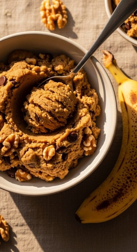 Very ripe bananas are a natural binder and sweetener that replace eggs completely in this dough — which means you don’t need heat-treated flour as your only safety measure. Use mashed ripe banana combined with oats (no flour required), nut butter, cinnamon, vanilla, and a small drizzle of honey. Fold in chocolate chips and chopped walnuts. The dough will be softer and more paste-like than a flour-based version, but the flavour is genuinely like raw banana bread batter — warm, spiced, and completely irresistible.