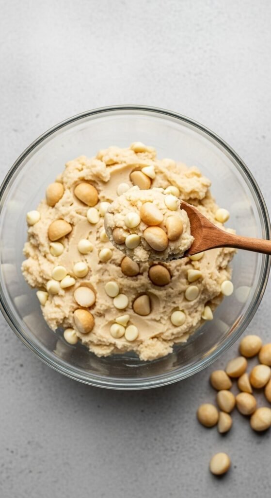 There’s something undeniably luxurious about white chocolate and macadamia together — it’s the cookie dough combination that feels the most like a treat rather than a snack. Use heat-treated bread flour for a slightly chewier texture than all-purpose. Combine with browned butter, brown and white sugar, vanilla, and a splash of cream for richness. Fold in quality white chocolate chips and rough-chopped roasted macadamia nuts. The saltiness of the macadamia against the sweet white chocolate is the whole point — don’t skip the extra pinch of sea salt in this one.