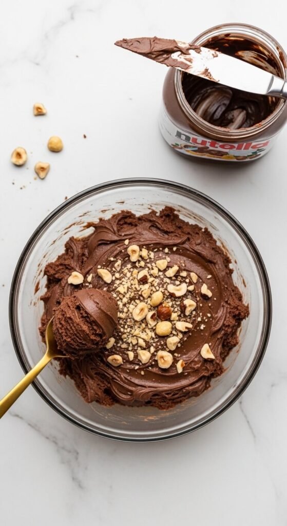 Nutella acts as both flavour and binder in this dough — it provides fat, sweetness, and that signature chocolate-hazelnut combination without needing much else. Mix Nutella with softened cream cheese, a small amount of powdered sugar, and a splash of vanilla. Add heat-treated flour to give it structure, or skip it entirely for a thicker, more truffle-like texture. Fold in roughly crushed roasted hazelnuts for crunch. This dough is best served in small amounts — it’s intensely rich. A little goes a long way, which makes a single batch last longer than you’d expect.
