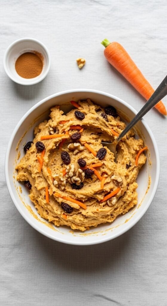 Carrot cake flavour in a spoonable dough is more achievable than it sounds. Finely shredded carrot adds moisture and a subtle natural sweetness without making the dough wet or sticky — squeeze excess moisture from the carrot before mixing. Combine with oats, cream cheese, powdered sugar, cinnamon, ginger, nutmeg, and vanilla. Fold in raisins and chopped walnuts. No flour needed here — the oats and cream cheese provide all the structure you need. This is one of the most filling doughs on the list, making it a genuinely satisfying snack rather than just a sweet treat.