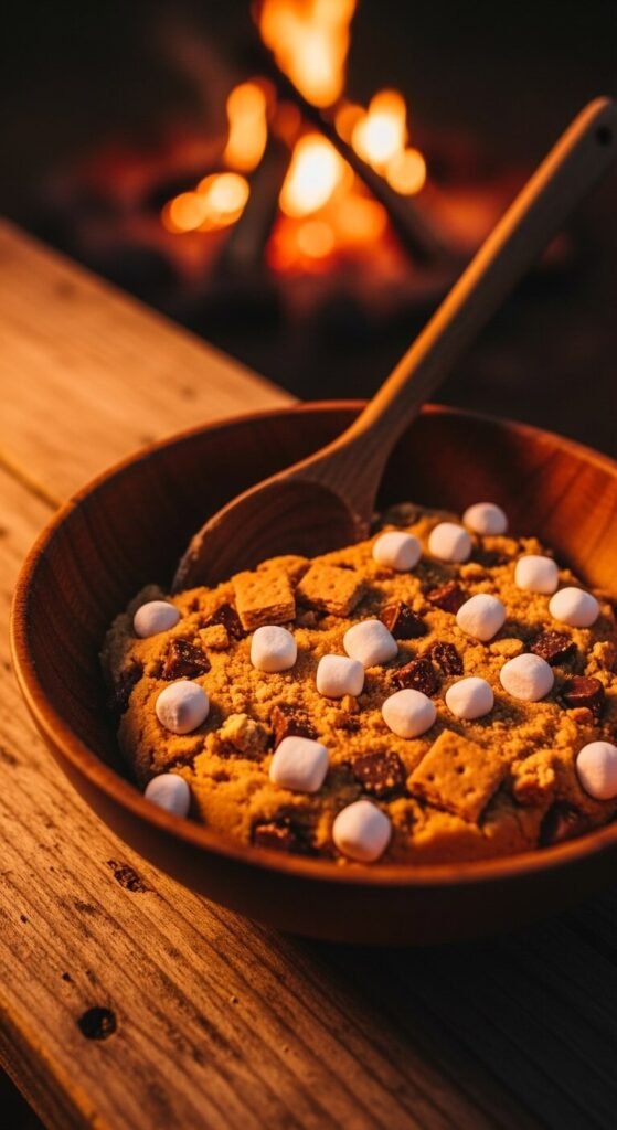 Everything a s’more is — minus the fire, the sticky fingers, and the three marshmallows that fall into the flames. This dough uses heat-treated graham cracker crumbs as part of the flour base, which builds the s’more flavour directly into the structure. Add butter, brown sugar, vanilla, and a small amount of heat-treated all-purpose flour for texture. Fold in mini marshmallows, dark chocolate chunks, and extra crushed graham crackers. The mini marshmallows stay soft and pillowy in the dough and add a chewy sweetness that makes every spoonful genuinely feel like sitting around a campfire.