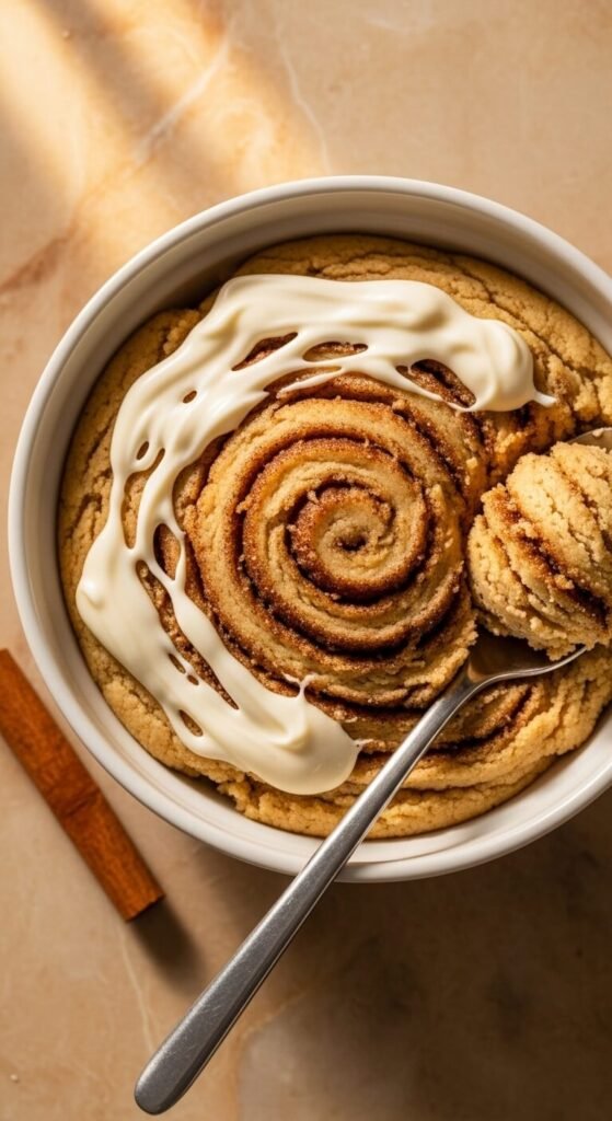 This dough tastes like the center of a cinnamon roll — which is the most coveted bite of the entire pastry. Make a cream cheese frosting-style base with softened cream cheese, butter, powdered sugar, and vanilla. Add heat-treated flour for structure and a generous swirl of cinnamon sugar paste (cinnamon mixed with softened butter and brown sugar) folded through rather than fully mixed — you want the swirl effect intact in the dough. Drizzle extra cream cheese frosting over the top before serving. This one is especially good served slightly room temperature.