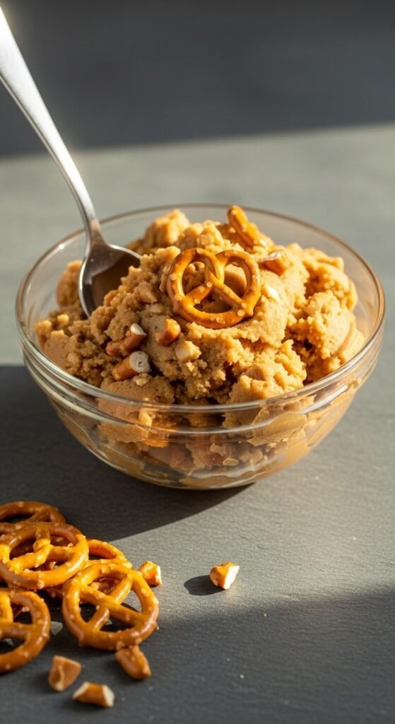 Sweet, salty, crunchy, and chewy all at once — this dough covers every sensory base in one bowl. The base is a simple brown butter and brown sugar dough with heat-treated flour, vanilla, and a generous pinch of sea salt. Fold in toffee bits (like Heath baking bits) and crushed salted pretzels added at the very last moment so they keep their crunch. Eat it immediately after mixing for maximum pretzel texture, or store it knowing the pretzels will soften slightly overnight — a different, chewier, equally delicious result either way.