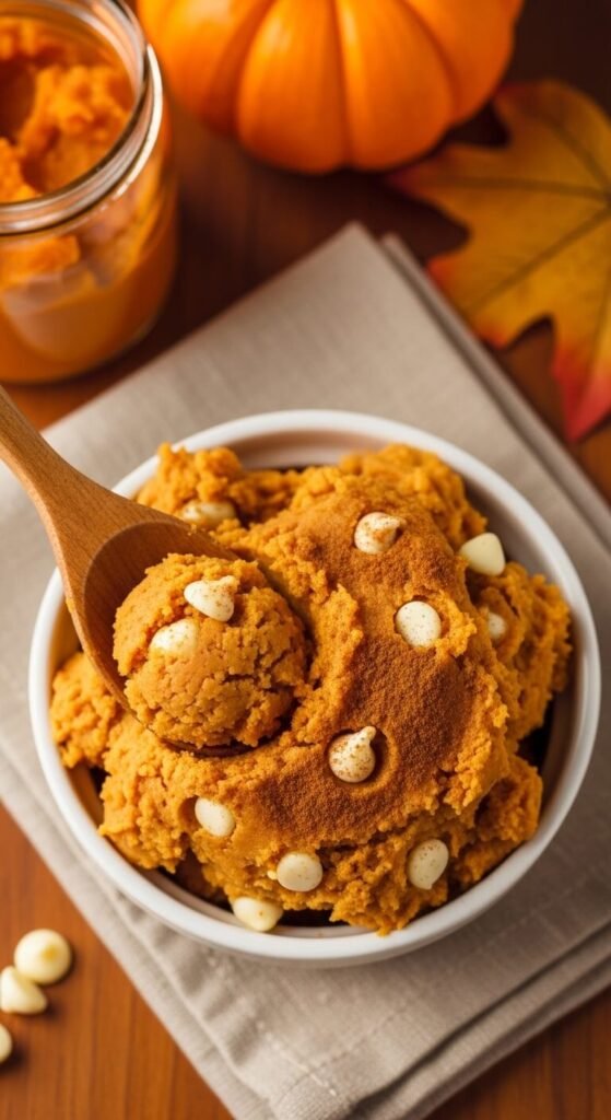 Pumpkin puree adds natural colour, subtle sweetness, and a slight earthiness that makes this dough taste like the inside of a pumpkin pie — in the best possible way. Because pumpkin adds moisture, use slightly less butter than a standard recipe and reduce the milk or cream to zero — the pumpkin provides plenty of liquid. Combine with heat-treated flour, brown sugar, cream cheese, pumpkin pie spice, and vanilla. Fold in white chocolate chips and pecans. This dough is thick and scoopable, not as firm as others — serve it in a bowl with a spoon rather than rolling it into balls.