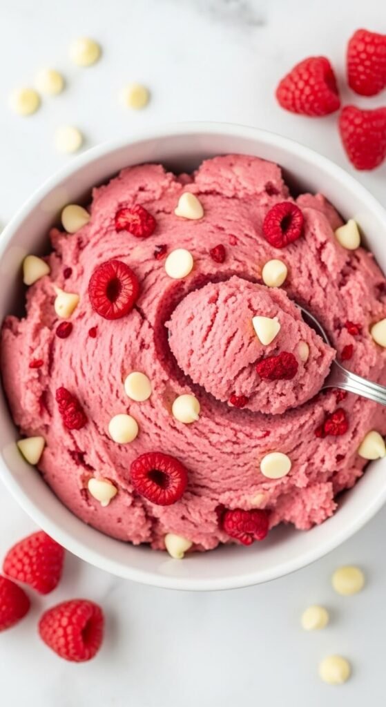Freeze-dried raspberries do the same magic here that they do in the strawberry cheesecake dough — intense flavour, beautiful colour, zero excess moisture. Grind half into a powder for the base and leave the other half as small rough pieces that add colour variation and tiny bursts of tart flavour throughout. Combine with heat-treated flour, softened butter, cream cheese, powdered sugar, and vanilla. Fold in white chocolate chips. The tartness of the raspberry against the sweetness of the white chocolate creates a flavour balance that tastes far more sophisticated than a simple cookie dough has any right to be.