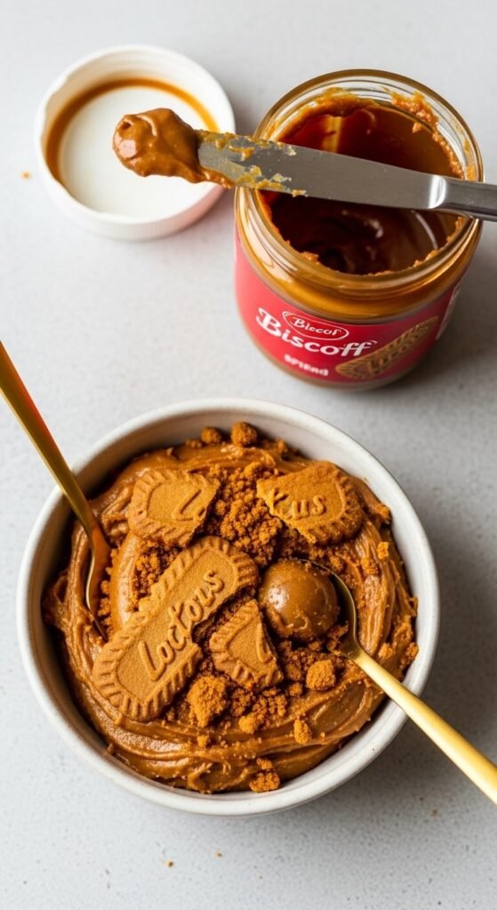 Biscoff spread has the same binding qualities as nut butter — fat, sweetness, and flavour all in one ingredient — which means this dough comes together with almost nothing else required. Mix Biscoff spread with softened cream cheese, powdered sugar, vanilla, and a pinch of cinnamon. Add heat-treated flour for structure. Fold in crushed Biscoff cookies for texture — some fine crumbs throughout the dough and some larger chunks for crunch. This dough has a deep, spiced caramel flavour that’s completely unique on this list and almost universally loved by anyone who tries it.
