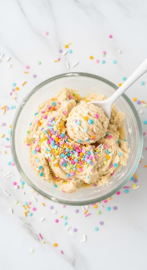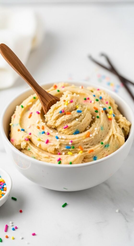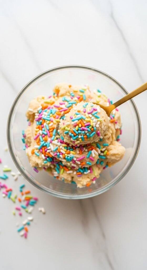 This is the most celebratory dough on the entire list — and it’s meant to be. The base is a cream cheese and butter dough with heat-treated flour, powdered sugar, almond extract, vanilla, and a tablespoon of dry vanilla cake mix stirred directly into the batter (the cake mix adds flavour and that specific boxed-cake-batter taste people are secretly obsessed with). Use confetti-style jimmie sprinkles in pastel colours rather than rainbow for the most beautiful result. Serve it at birthday parties, baby showers, or any occasion that deserves a little edible confetti.