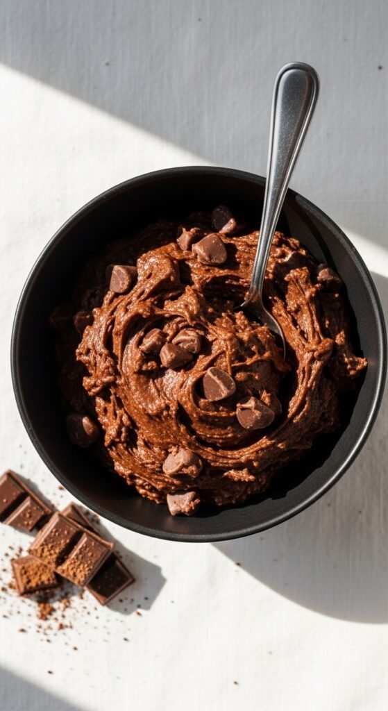 If you love brownies more than cookies, this one’s for you. It starts with heat-treated flour and cocoa powder, mixed with melted butter, brown sugar, and vanilla. A tablespoon of sour cream or Greek yogurt adds that slightly fudgy, almost batter-like texture that makes it completely irresistible. Stir in chocolate chunks or white chocolate chips for contrast. This one is excellent chilled — cold brownie batter dough has a firmer, more truffle-like consistency that’s incredibly satisfying to eat by the spoonful.