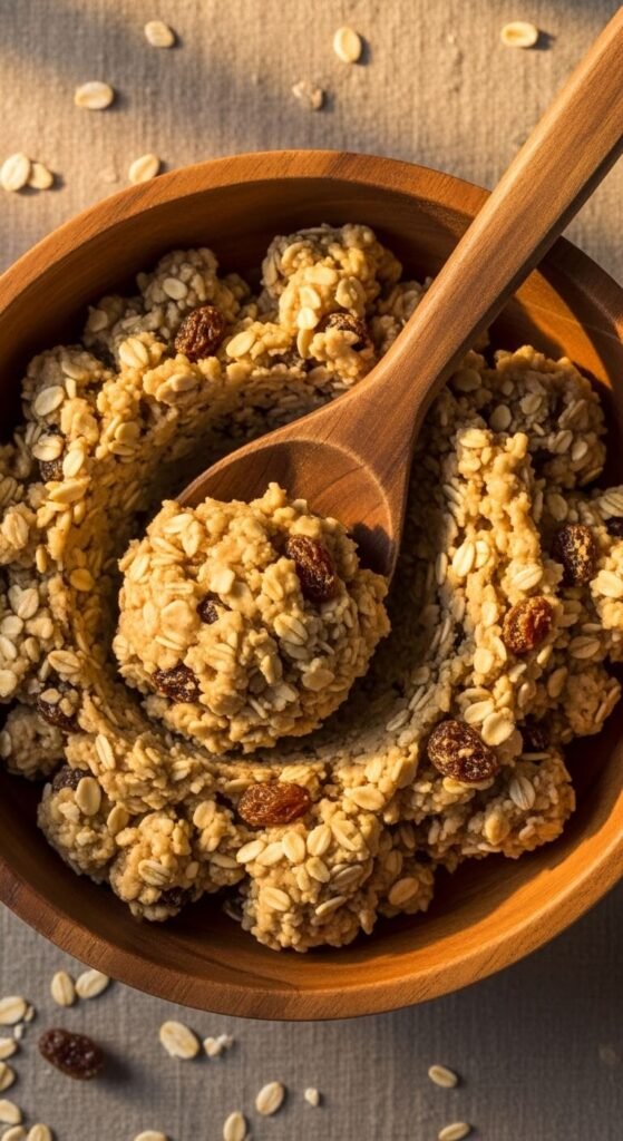 Rolled oats don’t need heat treatment the same way flour does, which makes this recipe slightly easier to pull together. Mix oats with softened butter, brown sugar, cinnamon, vanilla, and a spoonful of nut butter for binding. Raisins or dried cranberries add natural sweetness, while a small handful of chocolate chips or chopped walnuts adds richness. The texture is chewier than a classic flour-based dough — more rustic, more satisfying, and genuinely filling enough to work as an afternoon snack.