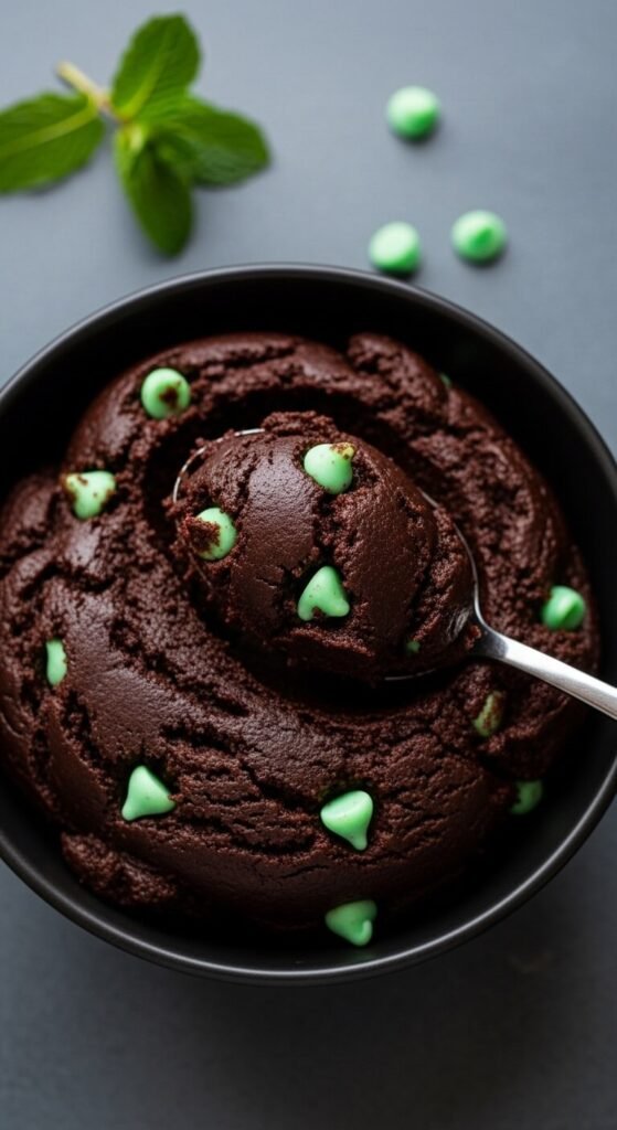 Chocolate and mint is a combination that never needs justification. This dough uses heat-treated cocoa-enriched flour, melted dark chocolate, butter, and powdered sugar as the base. The mint comes from pure peppermint extract — start with just an eighth of a teaspoon and taste as you go. It’s stronger than you think. Add mini chocolate chips and Andes mint pieces chopped roughly. Chill before eating — cold mint chocolate dough has a near-truffle-like quality that makes it genuinely hard to stop at one spoonful.